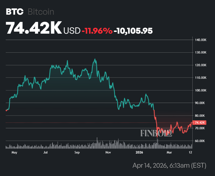 Bitcoin (BTC) steadies above $74,000 at press time on Tuesday after a 5% jump the previous day as the US blockades the Strait of Hormuz amid ongoing peace negotiations. US Vice President JD Vance shares a potential grand deal in motion for Iran while demanding an end to its nuclear program.Published April 14, 2026 03:50 UTC (7h ago) |