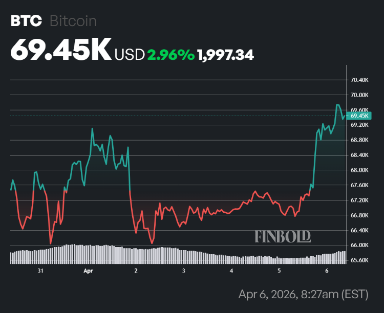 Bitcoin surging past the $69,000 mark and crushing over-leveraged bearish traders. By Alex Dovbnya Published April 6, 2026 05:14 UTC (8h ago) |