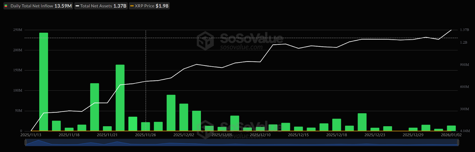 US spot XRP ETFs recorded US$13.59 million (AU$20.7 million) of net inflows on Jan. 2, lifting cumulative inflows since launch to about US$1.18 billion (AU$1.8 billion), according to data cited by SoSoValue. Traders said the ongoing buying has supported XRP in early 2026, even as broader crypto markets have been relatively flat. XRP moved above... By Jos Oramas Published January 5, 2026 05:03 UTC (1h ago) |