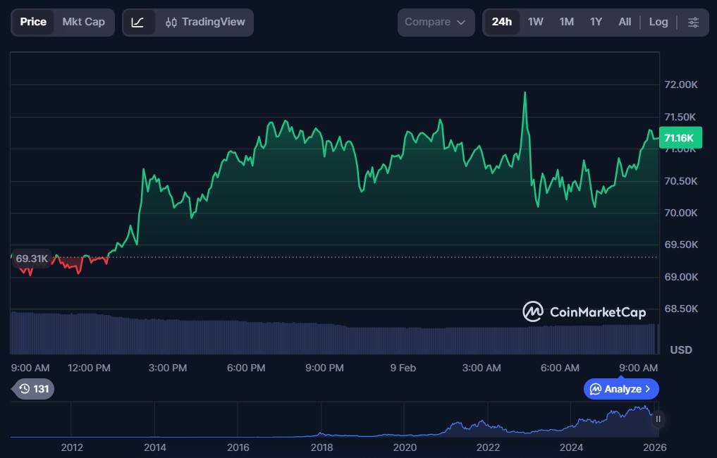 TLDR: Bitcoin struggles at $70K, revealing weak buyer power amid high trading activity. BTC trades at $71,098 with $44.95B in 24-hour volume, showing strong market participation. Reclaiming $70K could trigger 8–10% rally toward $75K–$77K resistance zones. Failing $70K increases risk of testing mid-$60K support in the short term. The price of... By Brenda Mary Published February 8, 2026 18:34 UTC (4h ago) |