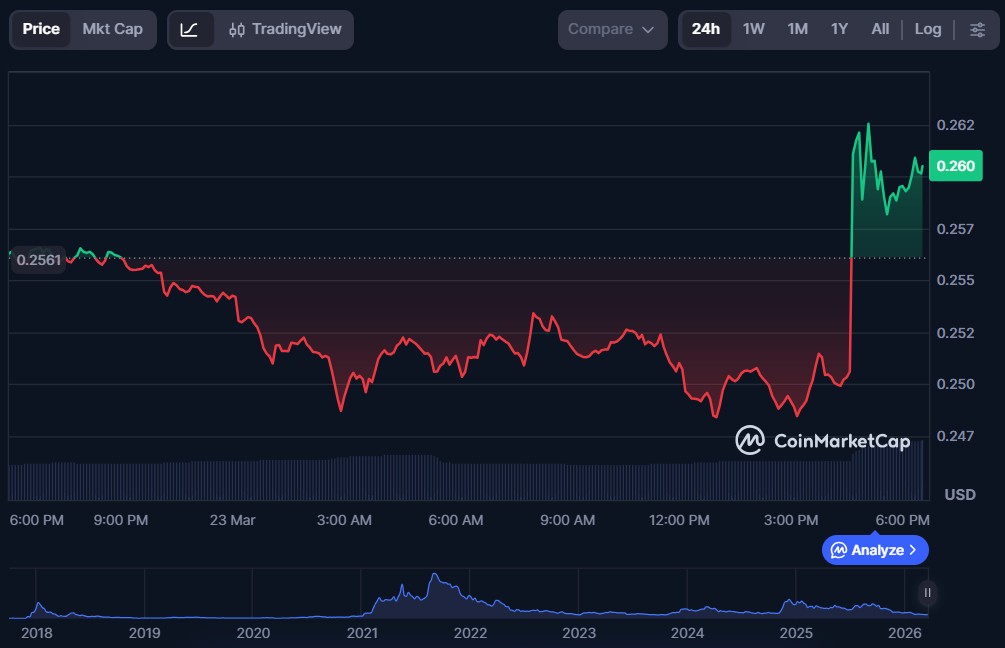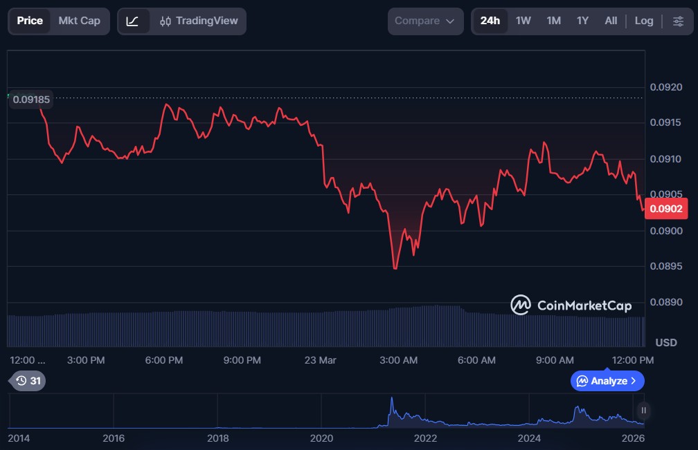 A new technical reading shows that Dogecoin’s price structure is not as weak as the surface-level price action might imply. In a recent post on X, crypto analyst Javon Marks pointed to a hidden bullish divergence forming on Dogecoin’s chart. The idea comes at a time when DOGE has been creating interesting low structures since […] By Sandra White Published March 23, 2026 19:00 UTC (2h ago) |