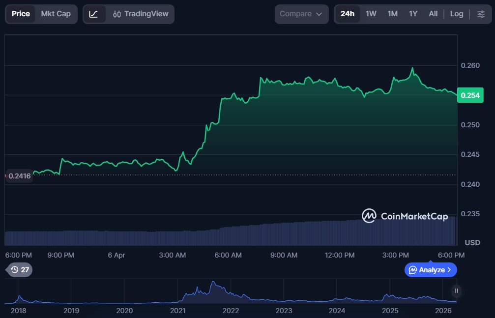 Cardano (ADA) price is extending gains, trading above $0.25 at the time of writing on Monday after staging a mild rebound the previous week. Strengthening on-chain data and improving derivatives metrics support a further upward move.Published April 6, 2026 04:37 UTC (9h ago) |