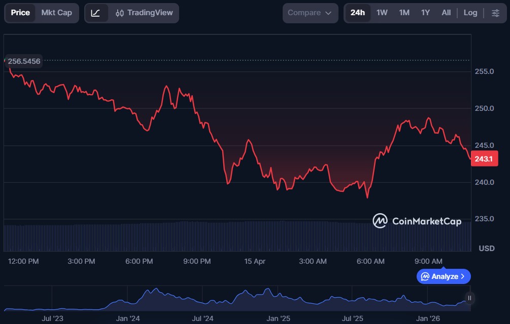 Cardano (ADA) is trading below $0.240 on Wednesday, down nearly 4% after a rejection at the key resistance level the previous day.Published April 15, 2026 04:46 UTC (7h ago) |